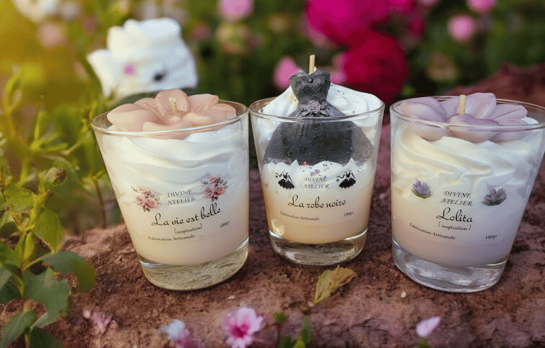 La boutique propose une gamme variée de bougies parfumées : classiques, gourmandes, fleuries avec des fleurs séchées naturelles, des bougies de lithothérapie, ainsi que des fondants parfumés, fondants crémeux et des décorations en jesmonite.